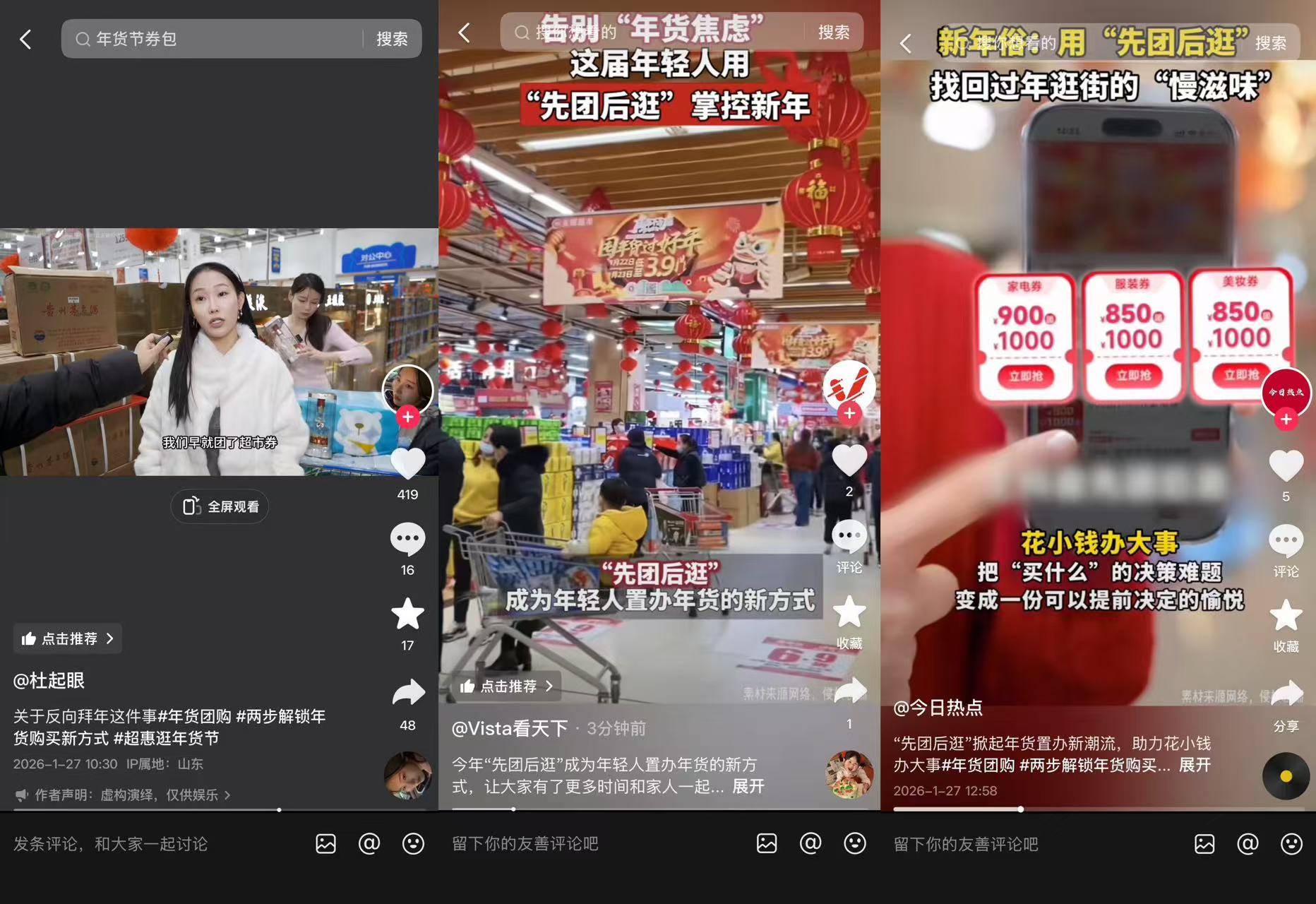 随着达人的花式种草,“先团后逛” 的消费新趋势进一步火出圈,成功吸引了主流媒体的关注。今日热点、Vista 看天下等蓝 V 账号紧跟热点,解读“先团后逛” 如何精准戳中年轻人 “怕超支、想省心、要年味” 的核心诉求,带动新年消费模式的更新,并重新定义着团聚的仪式感。