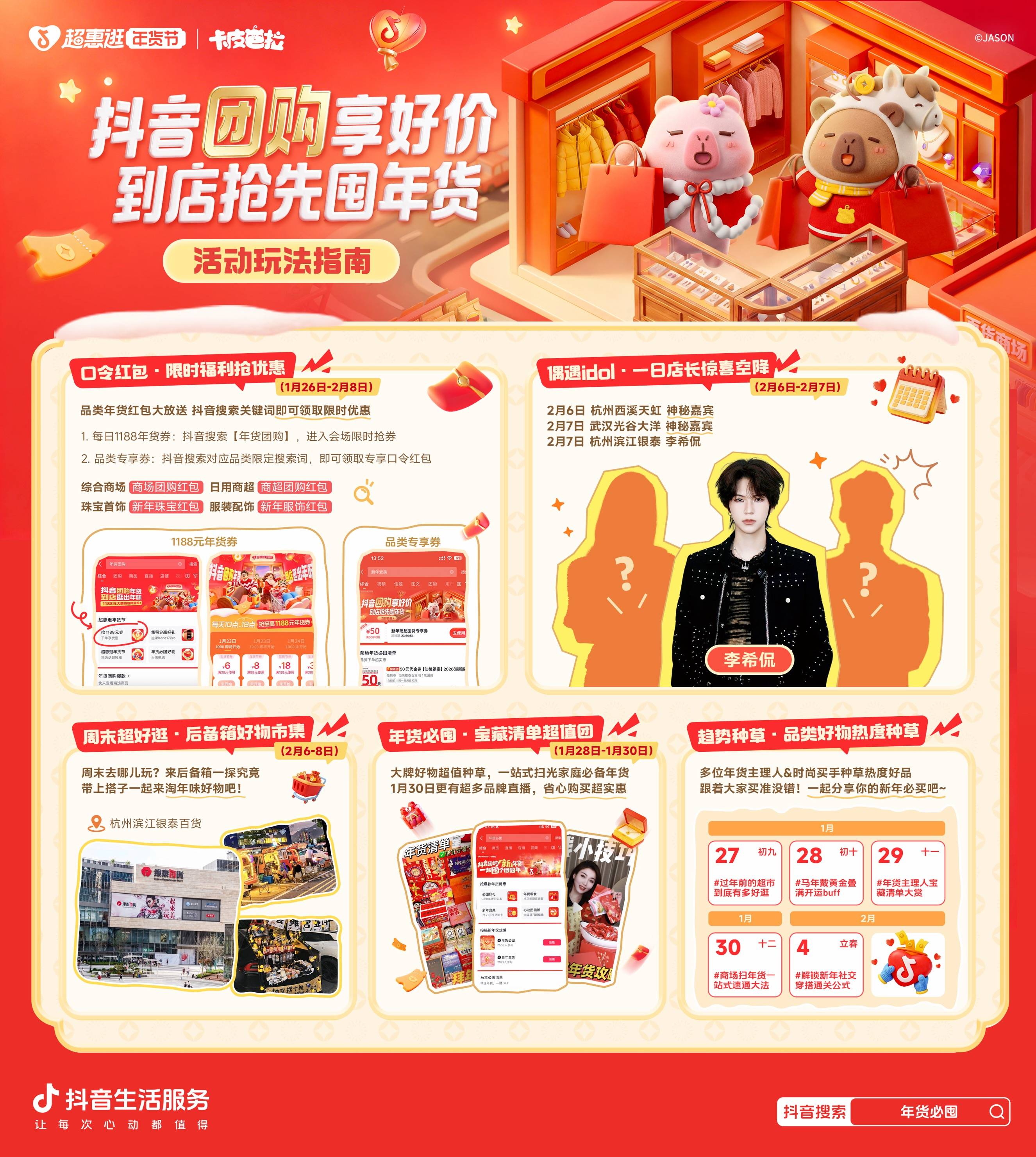 更多线下惊喜互动玩法等你来解锁:2 月 7 日,人气偶像李希侃将空降杭州滨江银泰百货化身 “一日店长”,与大家近距离互动,带来专属 “团逛” 福利;2 月 6 日至 2 月 8 日将同步开启热闹的 “后备箱好物集市” ,汇聚各类特色好物,快叫上你的新年搭子,一起来逛出烟火气、淘出新鲜感吧!