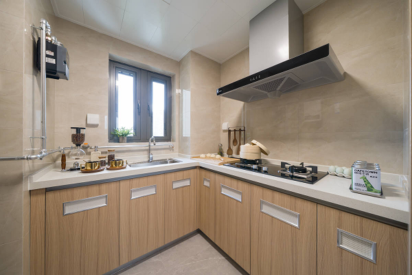 L型厨房配备直通室外的自然通风窗,采光与通风条件良好;各功能模块间距适中、流线顺畅,有效支持高频次、多场景的家庭烹饪需求。