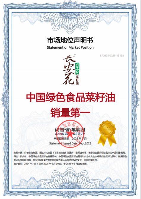 2025 年 9 月,尚普咨询集团正式向长安花粮油股份有限公司颁发“中国绿色食品菜籽油销量第一”市场地位证书,以第三方数据印证了长安花粮油在绿色食品菜籽油领域的领军地位。