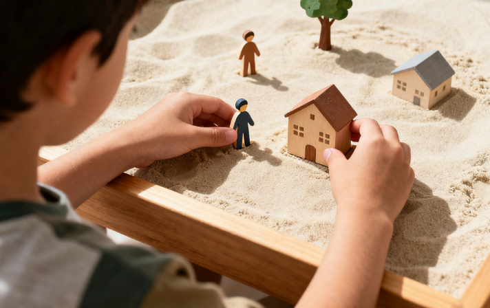 活动开始后,孩子们在万创育星指导老师的引导下,自由挑选自己喜欢的模型,小心翼翼地将它们摆放进沙盘中,构建属于自己的 “小世界”。有的孩子搭建了热闹的城市,里面有高楼大厦、汽车和行人,展现出对繁华世界的向往;有的孩子则打造了宁静的森林,有小动物、花草树木,流露出对自然的喜爱;还有的孩子构建了充满冒险色彩的场景,体现出内心的勇敢与好奇。在整个过程中,心理指导老师全程陪伴,耐心观察孩子们的每一个动作和选择,并不时与他们沟通交流,倾听他们对自己作品的解读。