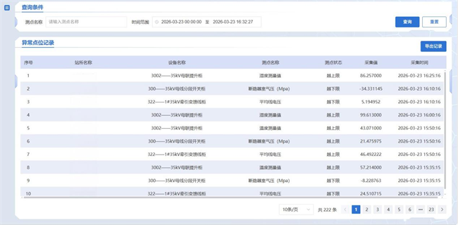 统一监测海量异常测点,记录异常数据。当采集值超出阈值范围时,系统自动识别并展示于异常测点列表中,实现异常快速定位与可视化展示。